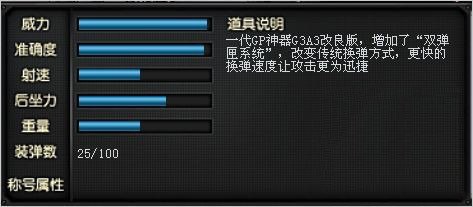 G3A3-SS是一代GP神器G3A3的改良版,增加了“双弹匣系统”,改变了传统的换弹方式,更快的换弹速度让攻击更为迅捷。