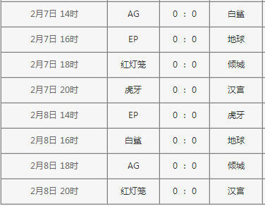 最后一周第一个比赛日的四场对阵如下:AGvs白鲨、EPvs地球、红灯笼vs倾城、虎牙vs汉宫。第二比赛日四场对阵如下:EPvs虎牙、白鲨vs地球、AGvs倾城、红灯笼vs汉宫。