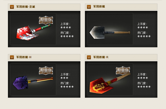 对于铁锹,CF官方给出了这样的评价:本该出现在工地上的装备,意外出现在了战场,宽广的攻击范围和巨大的破坏力让铁锹在这个世界变得更加有战斗力。回归现实,铁锹几乎随处可见,操作起来方便容易,挥舞起来所向披靡,甚至幸运时候一锹下去可以拍死几人。