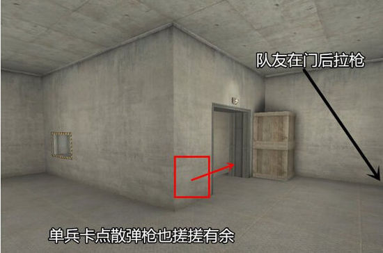 这种小配合在游戏中非常常见,也非常管用,在该点将步枪手换为散弹手后,击杀效率更高,大大减小包点拉枪线的步枪手的压力。另外在图中战神位拉枪线也可以取到相同的效果,总之对于散弹手来说就是好好地等着,必须有耐心,否则队友的付出就白费了。