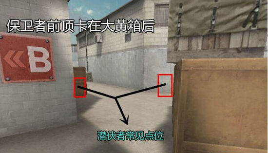 潜伏进攻B点除了B仓那么直接的方法之外,还可以选择中路转-B进攻,此时散弹枪可以通过回防路线来到B点,然后贴在墙后挺脚步,对于潜伏者来说快攻B点通常只会注意包点,往往忽视贴墙的敌人,此时再次出现背身让阴人的你心潮澎湃。
