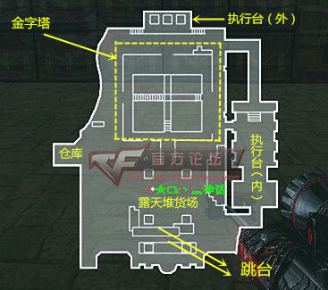 这张图是以山穴为支撑,由木箱,桥梁,仓库,露天堆货场,跳台,执行台(内,外),通道,金字塔等组成。整体规模较小,视野开阔,垂直差异突出。