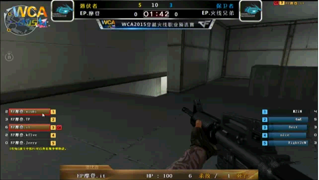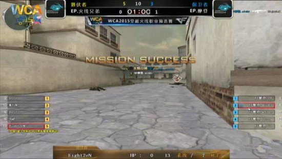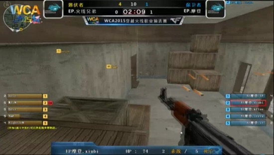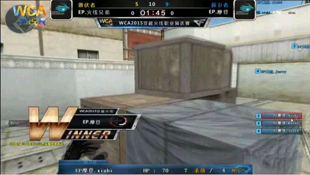 WCA2015职业预选赛(中国区)穿越火线项目小组赛目前采用B02赛制,小组赛阶段采用循环赛制。每场比赛获胜方积3分,失利方积0分。如果打平,双方各获得1分。比赛地图是:黑色城镇、沙丘、潜艇、港口、异域小镇。在4月28日,EP。火线兄弟与EP。摩登两只兄弟队伍最终以1:1比分内战打平收场。