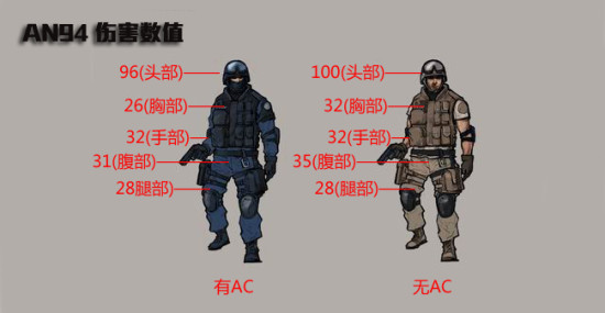这把枪的伤害介于AK和M4之间,单发伤害,在由AC的情况下不能一枪爆头。对于腿部和腹部伤害比较高,这就是为什么AN94一顿乱扫也能击杀的原因,虽然没有AK的超强伤害,但是对于身体部位的伤害都很高,弹道密集很容易击杀对手。