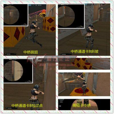 B通的卡点同样要注意保卫者的前顶防守,需要卡的点位基本分为4个步骤,1卡高点箱子、2卡对角、3卡左侧箱子、4卡B斜坡小平台。一定要按照这个顺序逐步排点,否则很容易被击杀。