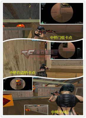中桥上的卡点一般都很危险,意在出其不意,不可多用。中桥门框的卡点通过门后箱子单人可以抵达,需要注意的是侧身A区的敌人。中桥右边桥的卡点较为隐蔽但是要小心敌人中门的狙击手。中桥卡A包点注意一点就是要站在桥上护栏,防止脚部暴露,同时注意水下。