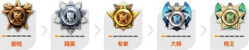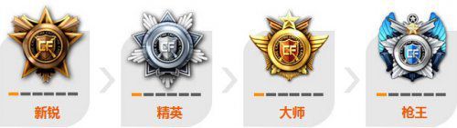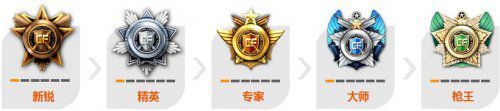 枪王排位勋章依次为:“新锐——精英——专家——大师——枪王”。每个段位里面有6个子段位