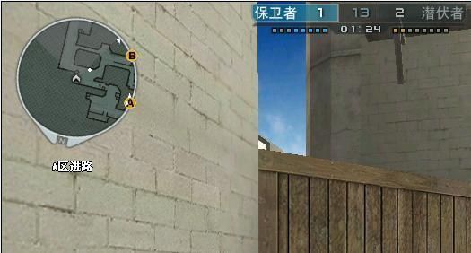 5. 地图中黄色圆框A和B标示爆破及幽灵模式下AB区(C4安放区域)如果黄色圆框变成红色,则代表该区已被潜伏者安防炸弹且保卫者已发现。