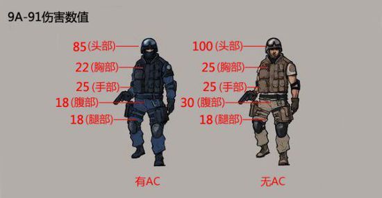 总的来说9A-91的武器伤害还是中规中矩,虽然比不上M4A1的伤害但是相比较于其他冲锋枪伤害还是很可观的。爆头伤害一般,面对有AC的敌人即使爆头还需要补一枪才能死,实战时需要注意。
