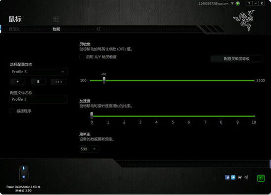 4、尽可能使用低灵敏度,最好能配上低DPI的鼠标。这是由于手指在点击鼠标的时候,手指对鼠标的冲击可能会带来轻微的鼠标位移,如果DPI高或者灵敏高的话,可能会带来准星的位移造成失准,这里我们以雷蛇鼠标为例。