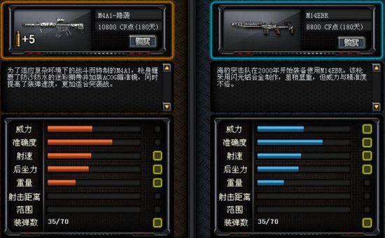 M4A1-影袭与M14ebr相比,在威力和精准的上M4A1-影袭没有M14EBR高,在射速和后坐力上双方相似,在重量上M4A1-影袭比M14EBR要重。