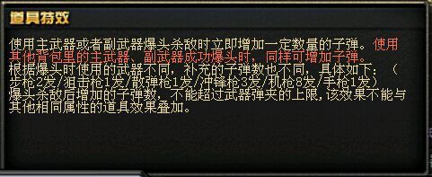 使用背包其他主武器或副武器成功爆头时自动填充子弹,步枪+2、狙击枪+1、散弹枪+1、手枪+1、冲锋枪+3、机枪+8,。