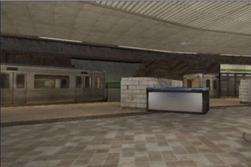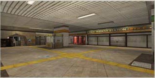 从地图的整体层面来说,这个场景属于一个标准的地铁站,在构造上保持着最原始简单的地铁式样,有下到月台的楼梯,也有标准双方向月台。但为了和现实 区别开,这里的地铁似乎废弃或者遭到的袭击,地铁站早已空无一人,两边铁轨上的地铁列车也已经被摧毁,隧道也已经被炸塌,看上去有些破败不堪。