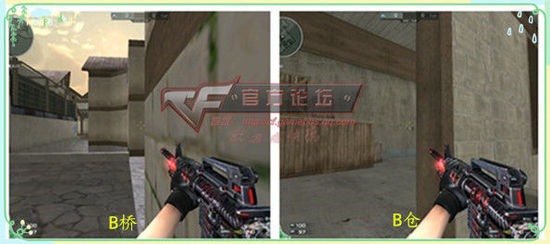 B桥这个点位和A大斜坡的点位道理一样,但是更加灵活,打掉一个或者2个敌人后可退入B水,灵活性很高,安全性也就相对提高了不少。B仓库的位置的点位卡点要灵活,左右2边来回移动判断敌人动向,配合闪光道具或者突然拉出扫射群敌。