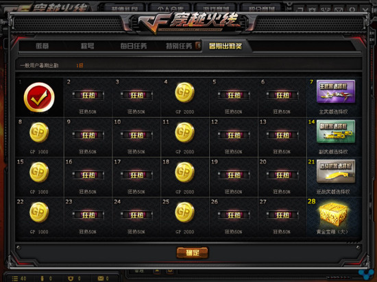 暑假CF领GP狂热黄金宝箱礼包 2015-07-05 18:06 新浪游戏 0 本活动没有网址,就在穿越火线客户端里。2015年暑假期间登陆CF,自动弹出。CF暑期出勤奖活动奖励 根据你暑假的登陆天数,获得奖励:GP、狂热加成状态、各种主武器副武器近战武器、黄金宝箱。黄金宝箱是什么 随机获得1件黄金武器。