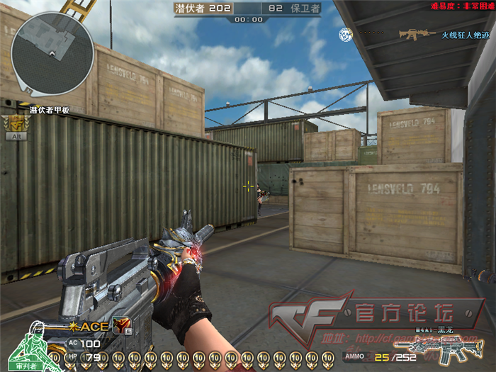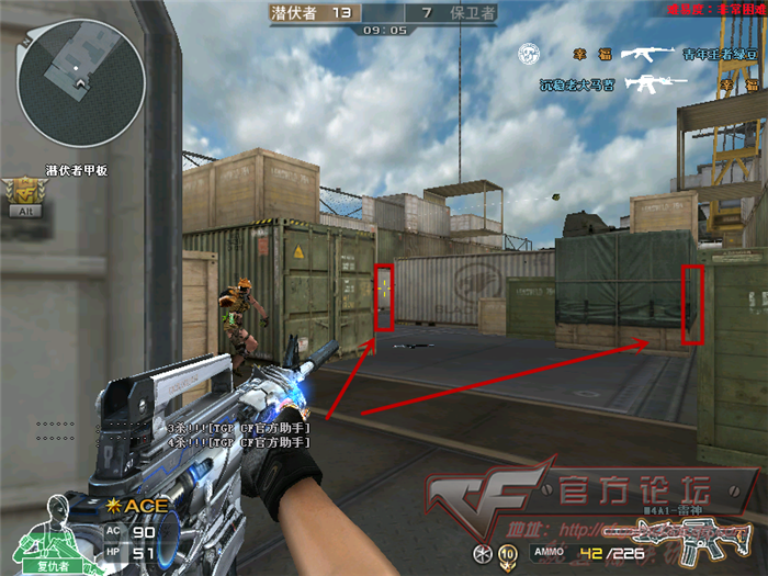 如果在左门你感觉到敌人攻击很猛烈,你可以换右门打,右门也是拿外开的大门和箱子之间的缝隙,作为掩体,不停的闪身,卡爆头线 ,速点!