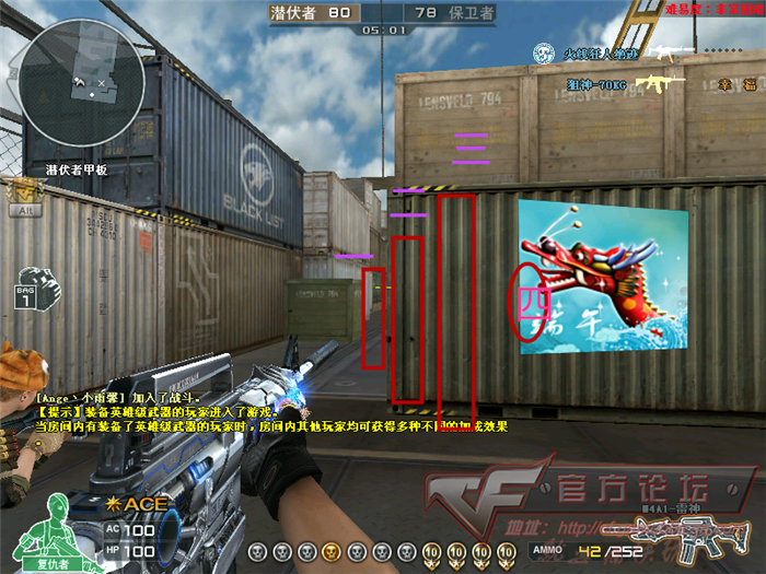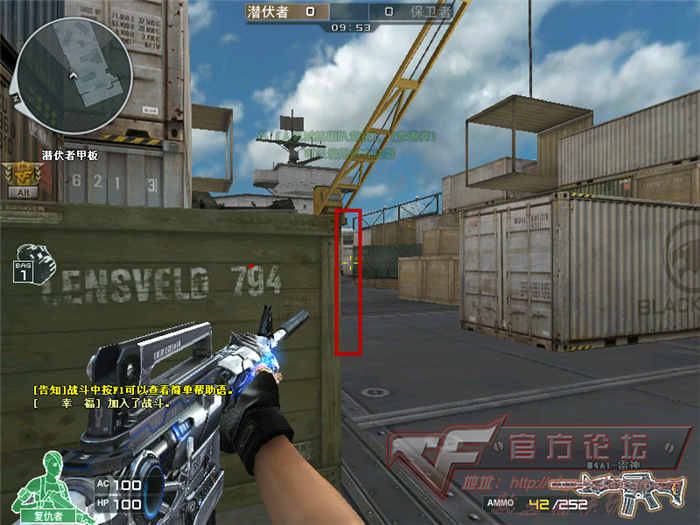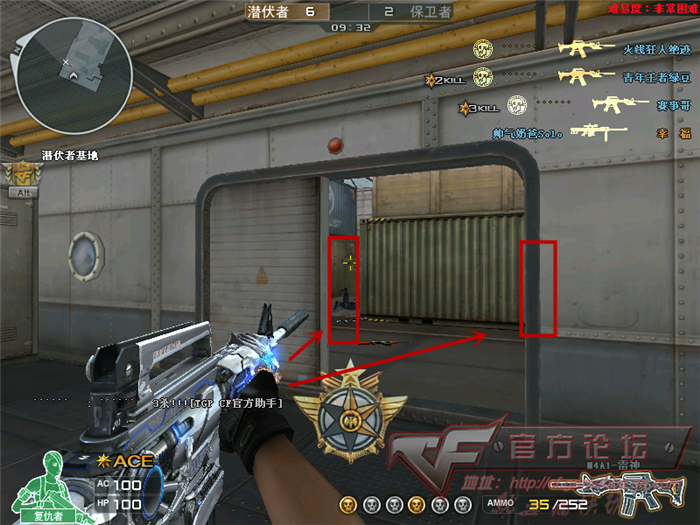 我用的是M4A1-雷神,游戏开始后,我会第一时间从F家左门出来然后卡在下图的 箱子后,卡住红色长方形内J家人物爆头线,利用箱子作为掩体,闪出一点,然后三连或者四连点射,射完闪身回箱子后,然后在闪出去,再开枪,周而复始直到迎来第一滴血(死了)。