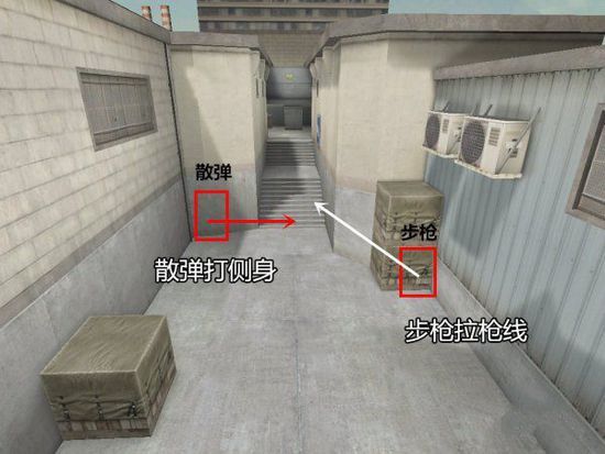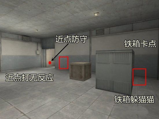或许有人说躲在A狗下不是要被活活穿死吗?那么请看图中所在位置,该位置前正好有一铁箱挡住了子弹的穿透,而且在A狗下拿着喷子根本不许潜伏者来搜 点,在如此狭小的空间内,使用打击者事半功倍,不过各位亲还是要注意其他方位的敌人哦,根据队友所在位置以及战况选择不同的预瞄位置,AG下是一个不折不 扣的后点式防守A区站位点。