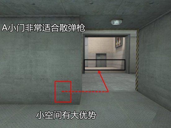A点防守不仅要防好小道这一关,中路是一个风水岭,潜伏者从中路可以进攻A也可以进攻B,散弹枪在A小门防守可以有效阻止大波敌人从A门进入进攻A区,散弹枪不仅在图中所在位置打侧身探点,也可以在稍后面的柱子后引诱敌人,形成就地反击。