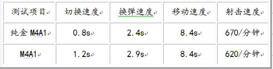 在枪械速度信息的上,相对于普通的GP点M4A1,纯金M4A1在切换速度、换弹速度、射击速度上都得到了不同程度的加强,移动速度方面保持一致。如果对比英雄级M4在换弹速度上会存在明显差距。