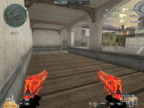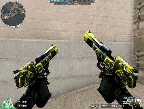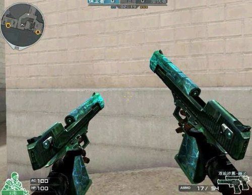 在电影中,我们经常听到类似双枪老太婆这样的名号,双枪顾名思义左右手同时开工,如果这种开枪方式如果可以同步到我们的CF中,每次按鼠标可以发射 出两颗子弹,那么是不是有一种无敌的样子呢?但是这样肯定会影响游戏的平衡啊,所以尽管火线里面很多的双枪沙鹰,但是都是一下一发的设计,说到这里,火线 中的沙鹰的确构成了一道亮丽的风景线。