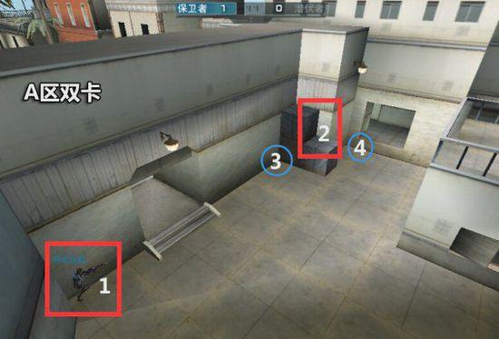 从图上可以看出,一共拥有4个站位可以很好的进行防守,可以分为3种站位方式。第一种1和2号站位,1号点主要防守A门,而2号点主要防守A小道,双方可以相互补枪,而且2号点的位置比较特别在箱子上,是敌人很想想到的位置。