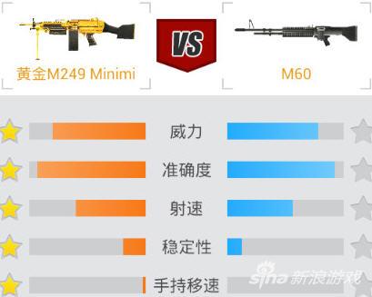 然后再将黄金M249 Minimi和M60对比,无论从任何方面黄金M249 Minimi都要优于60,综合来看黄金M249 Minimi属性略胜一筹。