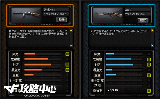 波波沙41的伤害更高,射速一致,重量更轻可以让波波沙41移动更快,载弹量虽然不如A180多,但威力大就弥补这一缺点,而且A180冲锋枪射击时枪声特别刺耳,而波波沙41射击时声音非常深沉。