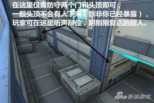 点位分析:其实这个点利用的原理很简单:游戏内的玻璃墙是即穿不透又可以观察敌人的,所以躲在玻璃墙后的玩家往往很占优势,他们既能够观察到敌人的走位,又能躲避敌人的子弹。一般来说,在这个点的玩家只要走位得当,是可以防守住一至两人的进攻的。
