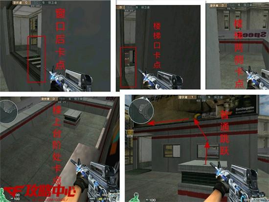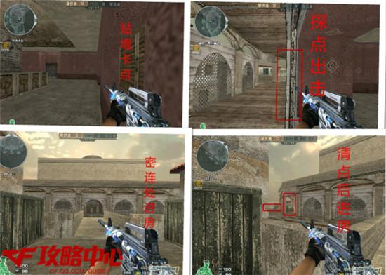 在 到达房子门口后,不要着急进入或直接上房,要逐渐清点,发现敌人时可以利用窗口闪身和敌人对枪。清点后,可以在一层门口贴墙处等待抢房子的敌人;还可以在 二楼楼梯口处卡点等待上楼的敌人;还可以在窗口处卡点等待上楼的敌人;也可以利用听声辩位的方法在二楼窗口两侧伺机攻击敌人;还可以跳到广告牌处卡点袭击 上房的敌人。