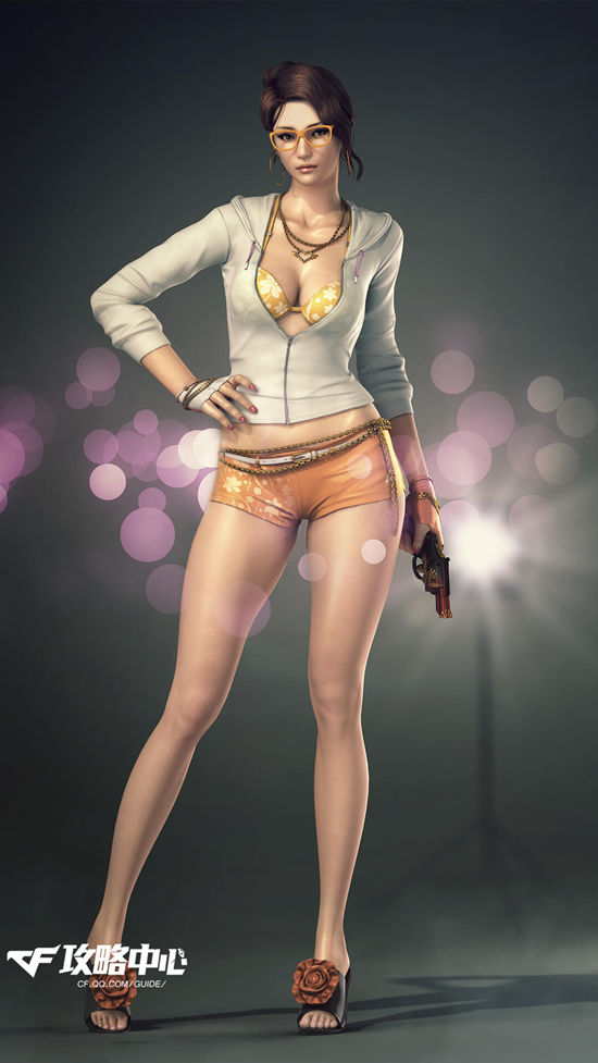 潜伏者:红色的短发下佩戴者一个可爱的黄红色小眼镜,身上穿着纯白色的T血衫,腿上超细的橙色短裤,流露出性感的味道。