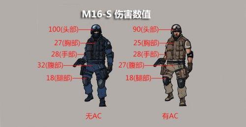 M16-S的威力在步枪中属于中等偏下水平,威力和M4A1步枪相似,无法造成无视AC一枪秒人,属于精准度高,威力较为中小的一类步枪,适合中距离点射和连发。