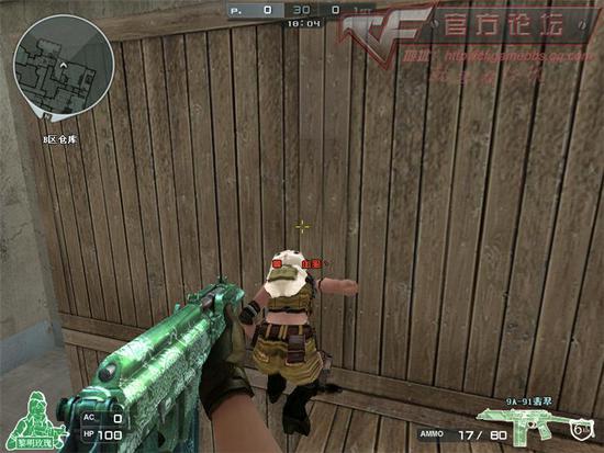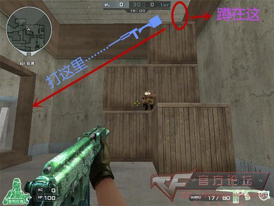 上图用枪打的地方,就是我们卡上二层箱子的地方,方法是:紧贴箱子,按住W.S键,使用跳蹲就可以上去!