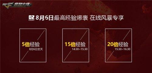活动内容:8月6日,5倍、15倍、20倍经验全服开放,不同时间参与游戏可尊享不同经验收益加成。