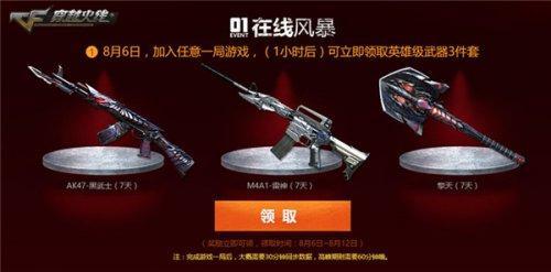 活动内容:8月6日登录游戏,并参与任意模式单局,即可领取英雄级武器3件套。