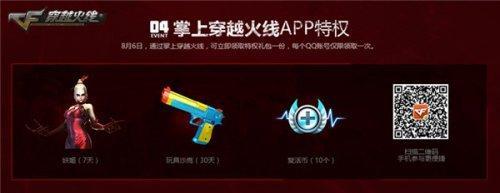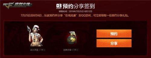 8 月6日活动当天,通过掌上穿越火线可领取特权礼包1份,内含妖姬(7天)、玩具沙鹰(30天)和复活币(10个)。值得一提的是,7月25日至8月6日, 提前预约分享活动还可获赠分享预约礼包1份,打开礼包可获得活力灵狐(7天)和龙腾手雷(7天)。而在7月25日至8月6日期间,累计登录满一定天数,即 可领取对应的累计签到奖励,包括斯泰尔-巧克力(7天)、夺命之镰(7天)、AWM-银月(7天)、复仇+雷霆+幻影道具卡(各1张)。