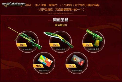活动奖励:奥运宝箱A:AWM-奥运(7天)、尼泊尔-奥运(7天)、沙漠之鹰-奥运(7天)、奥运纪念名片(30天)、奥运纪念喷图(30天) 。