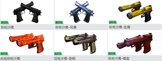 双持沙漠之鹰最初是于挑战模式刷出来的枪,双持沙鹰之后子弹更多,射速更快,得到很多玩家的青睐。不过唯一的缺点就是换弹速度太慢。此系列枪械大多是通过挑战模式获得。比如双枪沙鹰-幽灵是通过“巨人城废墟”获得,双枪沙鹰-金魔是通过“雷霆塔”获得,双枪沙鹰-黎明是由守卫挑战获得。此类枪械共有9把以上。