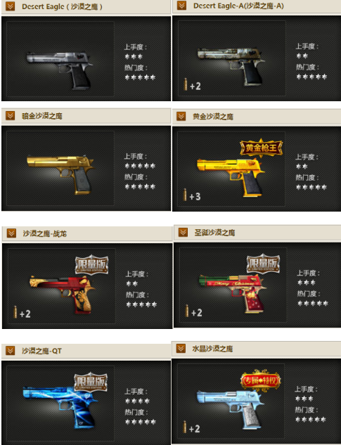 沙漠之鹰(Desert eagle)又称为手枪之王,在穿越火线中算得上是比较火的一款副武器,占据了手枪领域的半壁江山。之所以沙漠之鹰这么火热是由于它是一把综合性能很高的一把手枪,它不仅弥补了左轮手枪子弹少的缺点,还弥补了毛瑟手枪威力小的缺点。在游戏中更是拥有众多不同的版本。今天我们就来盘点一下各种不同的沙漠之鹰。
