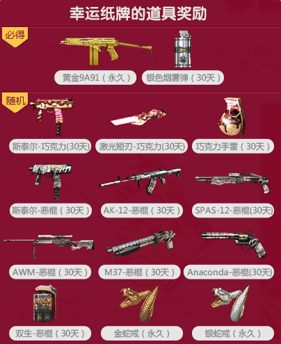 2,每天玩1局CF可翻纸牌(抽奖)1次,获得奖励。累计翻4张纸牌,可再打开1张幸运纸牌,必得黄金9A91(永久)+银色烟雾弹(30天)。