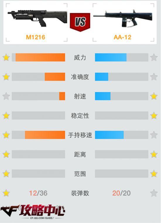 由 武器对比可得,M1216与当今比较热门的AA-12相比来说,M1216的威力和准确度都是略大于AA-12的。在游戏中,M1216这把枪的准星比 AA-12的准星稍小,因此M1216每一次所发射出的八发子弹相对来说比较集中,精准度较高一些。在稳定性、射程距离和范围方面来说,这两把枪不分上 下。虽然AA-12的射速比M1216的射速要快,但是大家都知道AA-12的射速是十分恐怖的,这也是这把枪的一大亮点。而M1216这把枪的射速在霰 弹枪界算得上是中规中矩,不能说它慢。