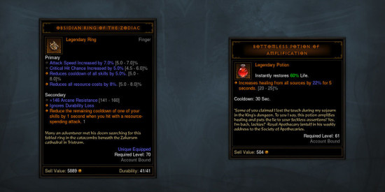 第三季最令人兴奋的内容就是赛季期间限定的全新传奇物品,大家可以在下方图片看到传奇宝石闪耀冰晶与毁伤之御,除了翻新过的黄道之黑曜石戒,还有无尽增强药水这款全新的传奇恢复药水。
