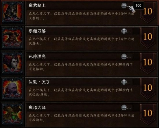 - 提示:T1难度速杀成就,每个Boss的时间限制都不一样。这个成就可以在冒险模式完成,不过伊斯卡图则必须进剧情模 式第四章才能击杀。对于常玩HC的玩家而言,这个成就可以算是小菜一碟,1600白金币的奖励也是相当丰厚。如果你平时不玩HC,那就搞一身坚韧装找大腿 带吧!如果战斗中不幸死了先别退,坚持等到队友干掉Boss也可以拿成就,别问我是怎么知道的……