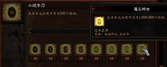- 提示:"在秘境中击杀100万个怪物",这个成就是所有成就中耗时第二久的,好在本身与日常游戏内容并不冲突。奈非天秘境与宏伟秘境中的击杀均会被统计在内,所以只要坚持多刷秘境就可以了。如果想要集中完成,可以适当下调游戏难度,保证清图效率。