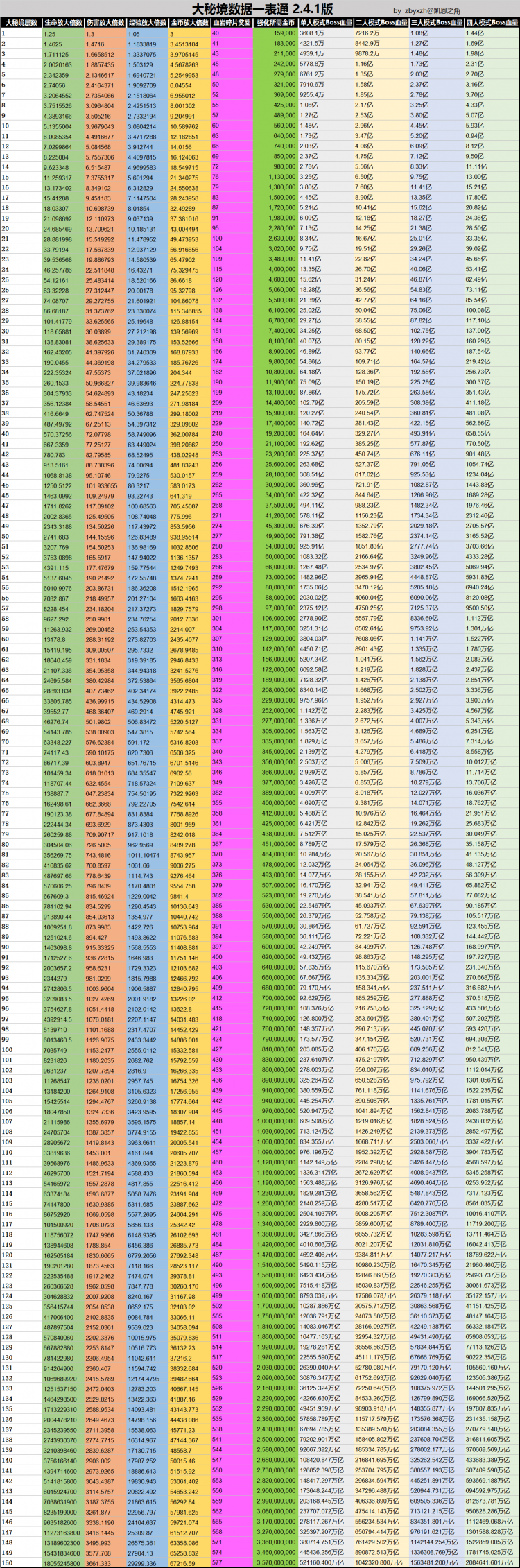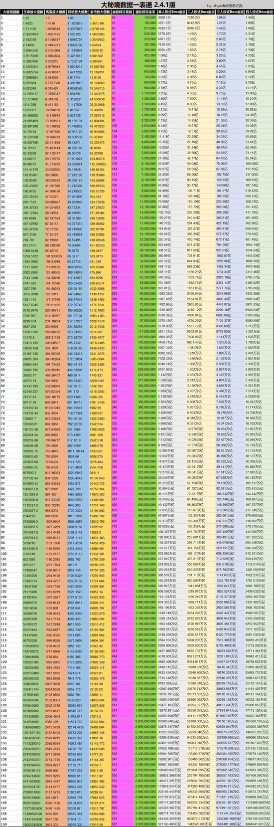 暗黑3 2.41大秘境的奖励统计 2016-04-29 11:56 新浪游戏 0 1、数据已更新至游戏版本2.4.1.36595; 2、收录了所有大秘境怪物的生命值、经验值及进度值; 3、表中大数字将以万、亿、万亿作为单位,方便阅读。 点击查看大图