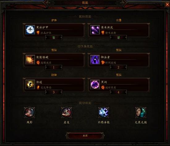 技能是冰黑人、冰黑洞、灾厄传送、电奔、连锁聚能、冰甲,被动如图。