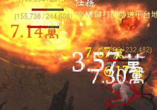 50范围伤的情况下打群怪的伤害,可以看到一个3.57的白字,和7.14的黄字。3.57/7.14=0.5,可以确定特效火球触发范围伤。