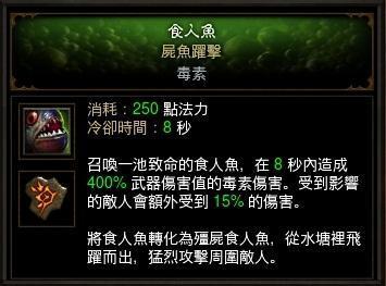 从池塘里飞出去的食人鱼会咬怪物,也算是击中,而且会不断飞出食人鱼,相当于可以触发12秒祖套特效,本身CD才8秒,触发很优秀,作为一个增伤的诅咒技能也不错。