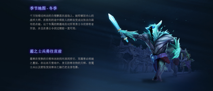 千万别错过纯洁的白雪飘落在战场上。随即解放内心的战术大师,在胜利的途中将敌人的鲜血变成这张洁白画布的点缀。这个专属的寒霜地形对所有勇士令状持有者开放,并且在勇士令状过期前一直可用。