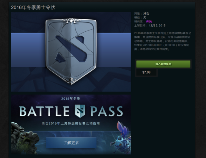 2016年冬季勇士令状将是2016年冬季Dota的战场伙伴。拥有了勇士令状就能完成多种游戏内任务挑战,拓展自己的Dota技艺,还有浅易的预测系统增加比赛的激情,并提供丰富的专属珍藏和奖励,为自己铸就通向声望和财富的道路。